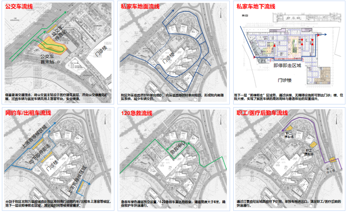 优化院内交通组织流线:按照“地下走车、地面行人,各行其道、避免交织”的通行原则,设计6条针对公交车、私家车、网约车/出租车、救护车、后勤车等不同交通组织流线,实现不同类别交通出行的安全与高效。
