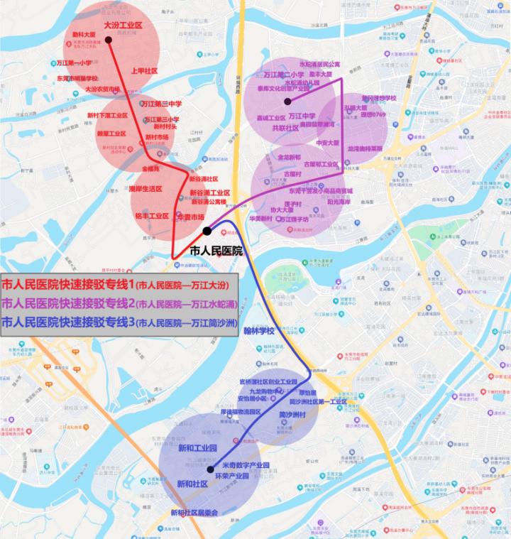 东莞市人民医院公交枢纽站推出“10分钟巴士”共3条快速接驳专线(地铁快线R101、R102、R103),串联周边社区、小区、产业园、学校、商圈等